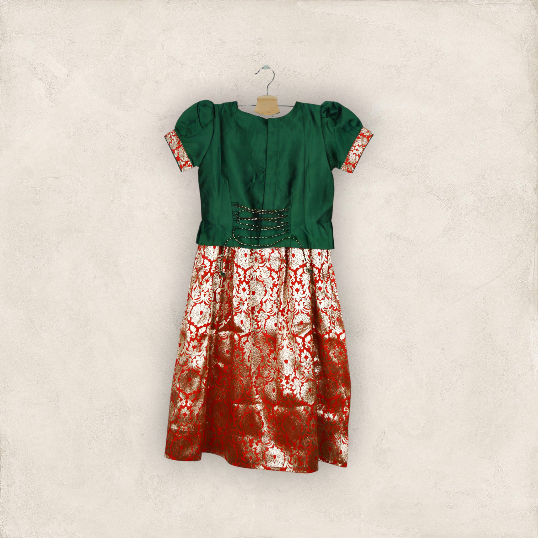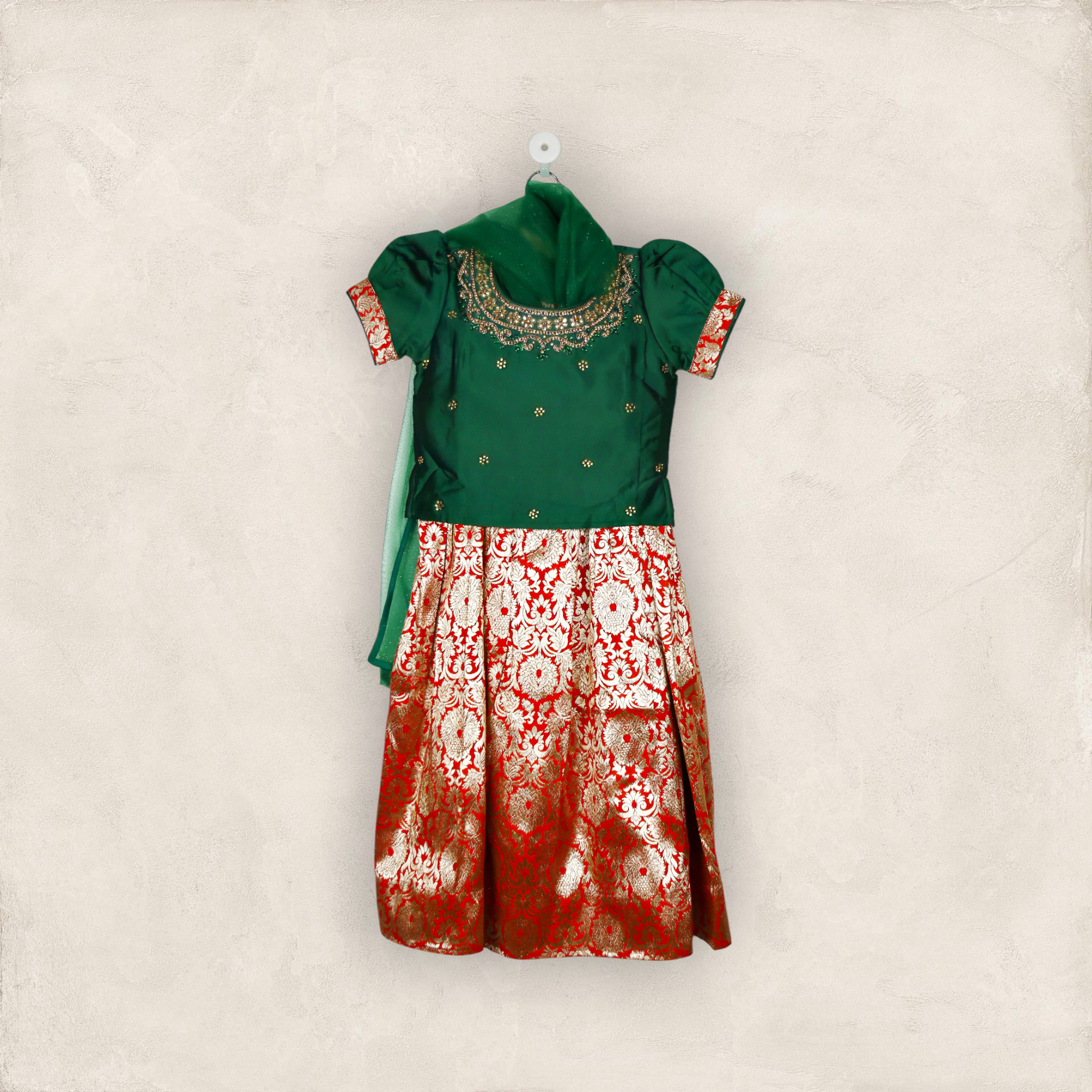 Green And Orange Tussar Lehenga Choli Set With Dupatta/7-8 Years