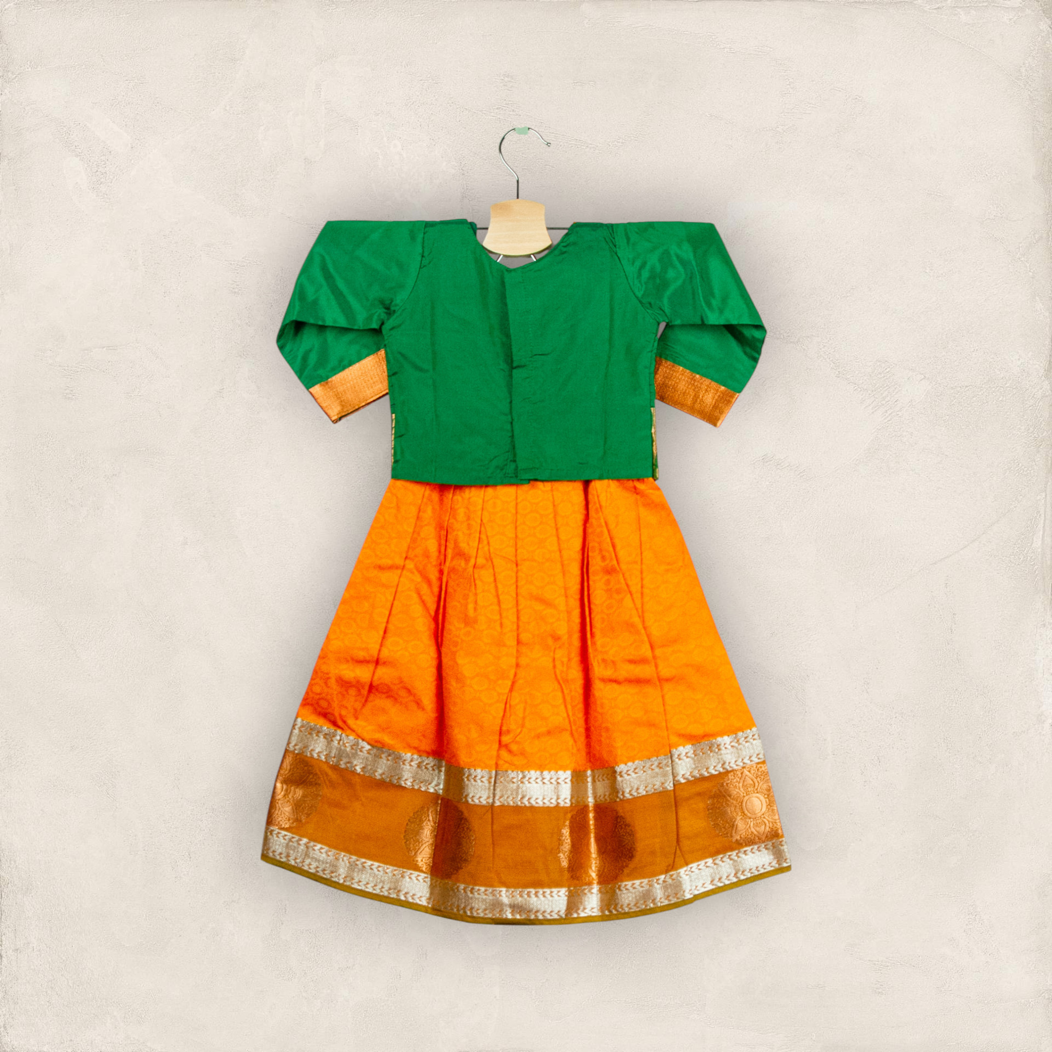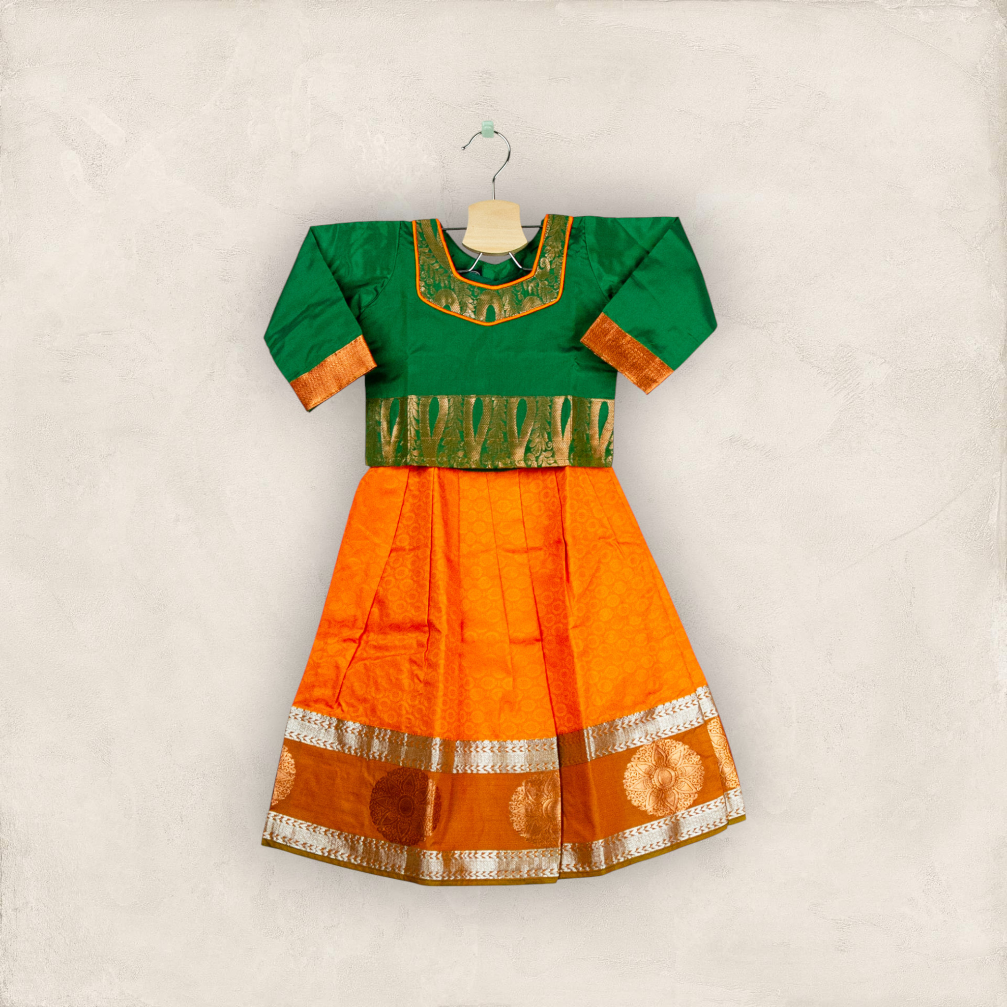 Mango Orange Big Border Pavadai with Bottle Green Short Chattai
