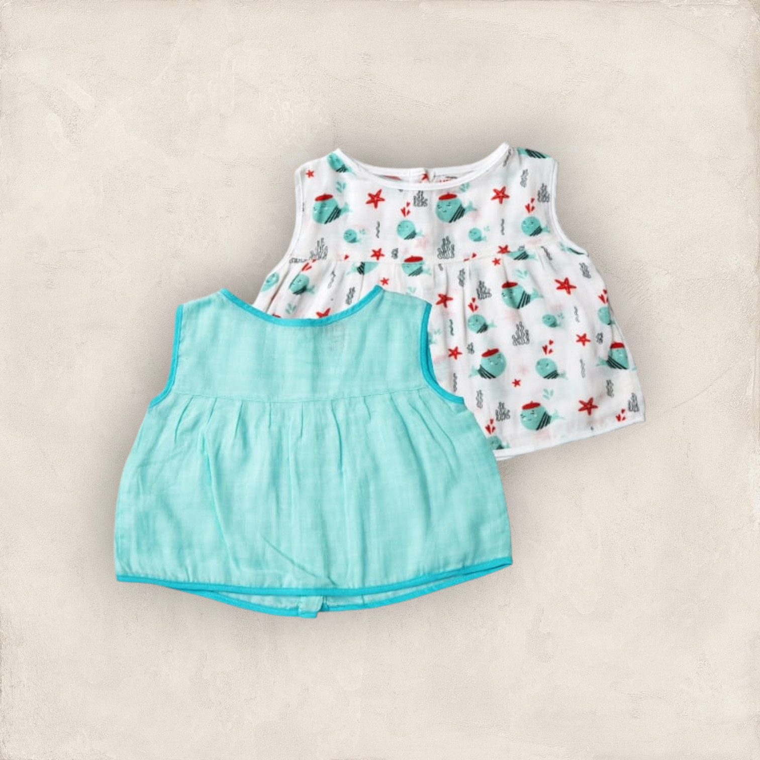 Muslin Jabla Blue Set Yoke Frock-Back Open Set of 2
