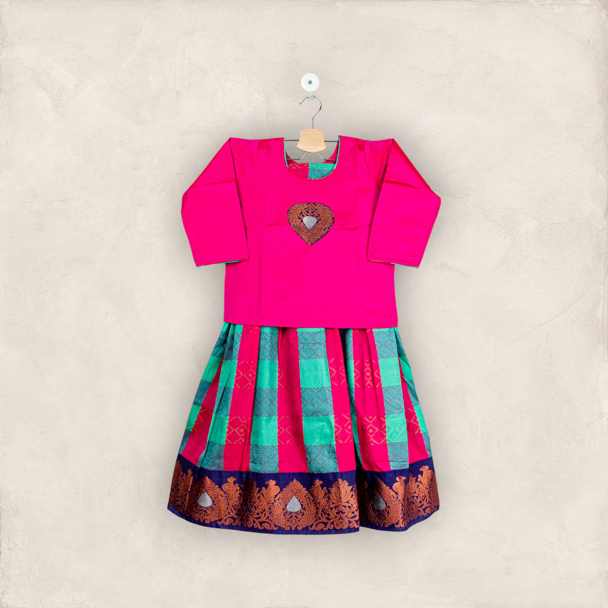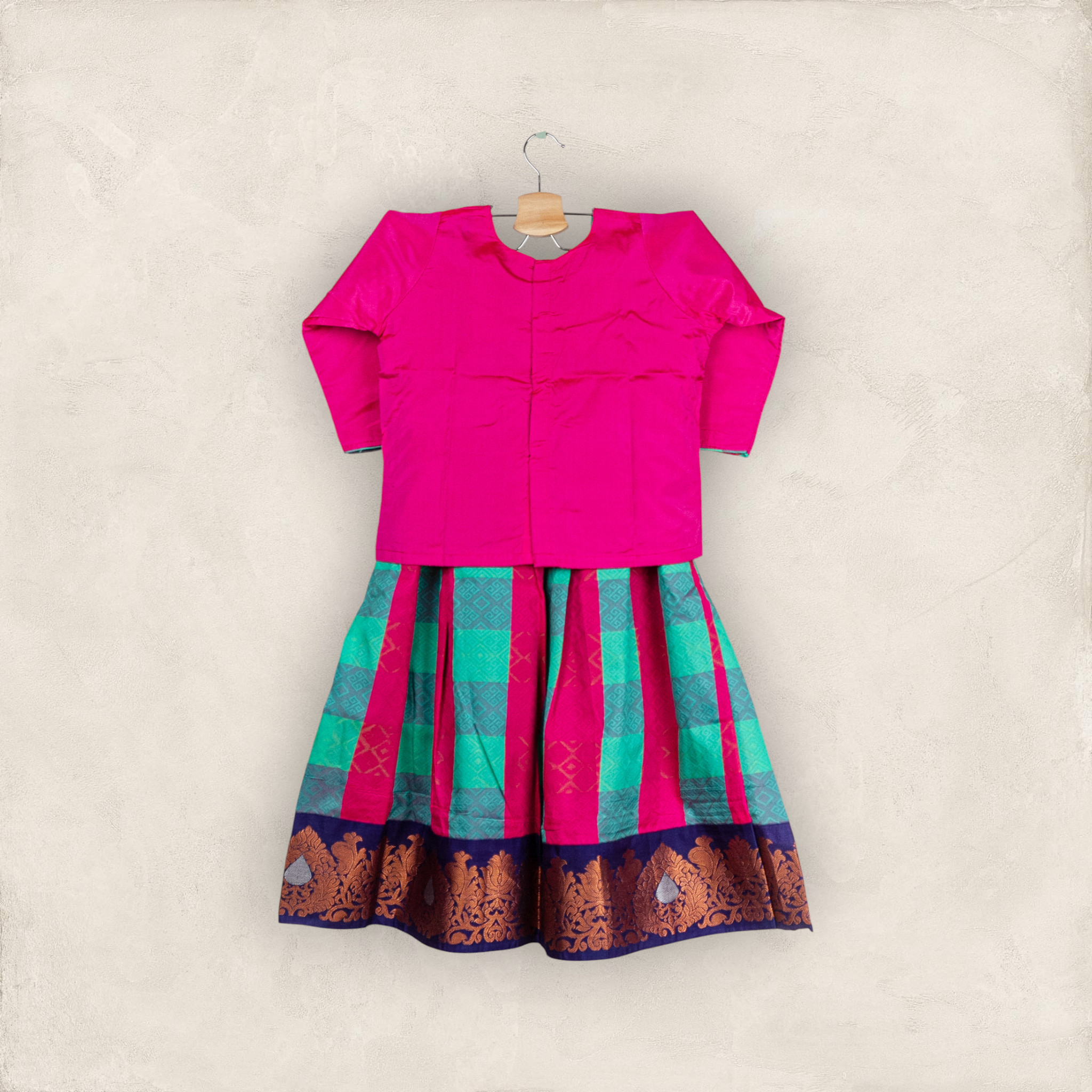 Pink and Green Checked Pavadai with Petal Pink Patch Work Chattai