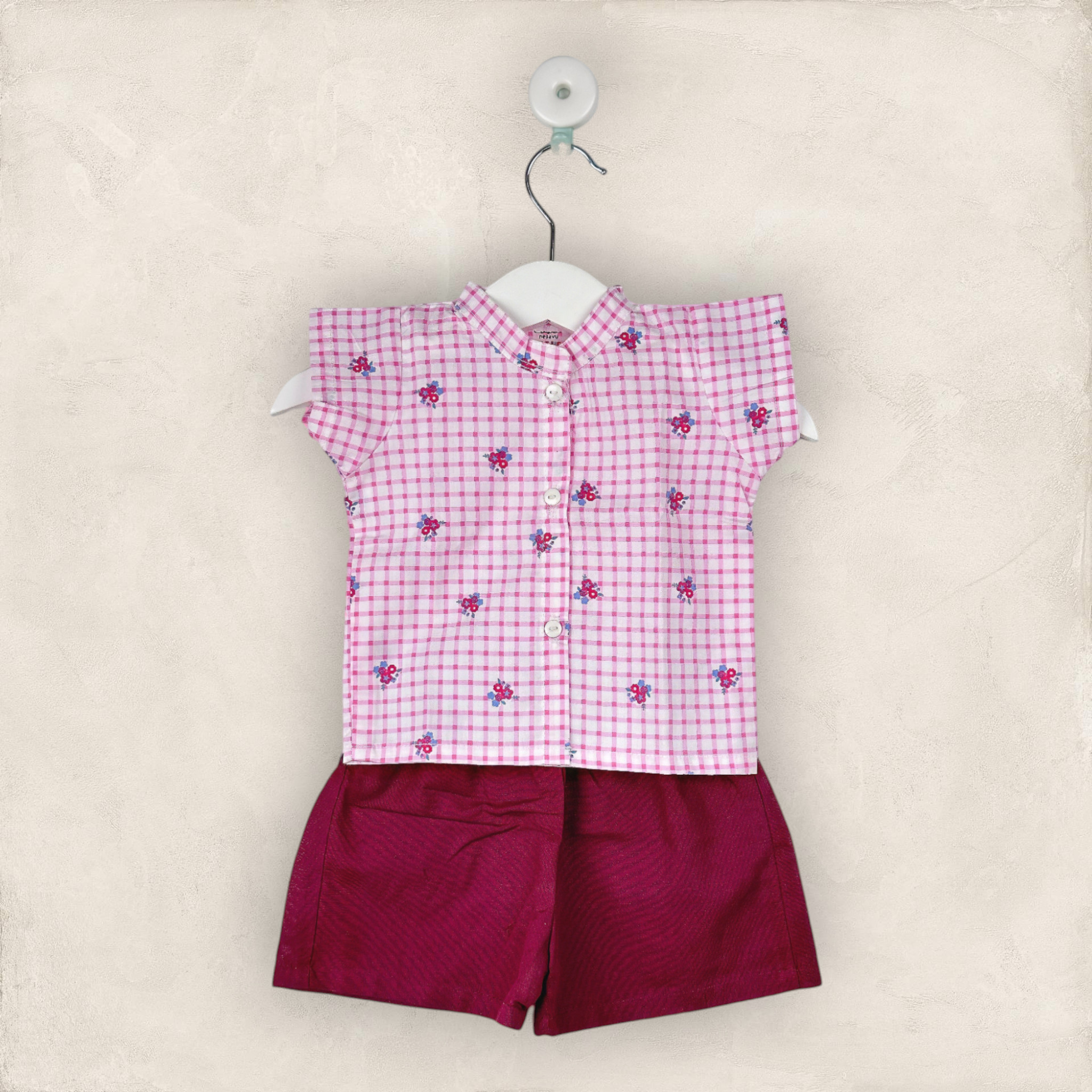 Pink Shirt With Checks And Maroon Shorts In Cotton