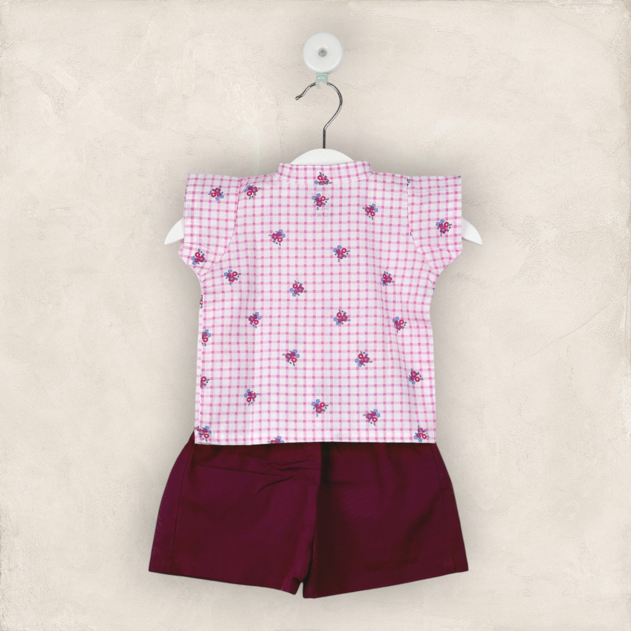 Pink Shirt With Checks And Maroon Shorts In Cotton