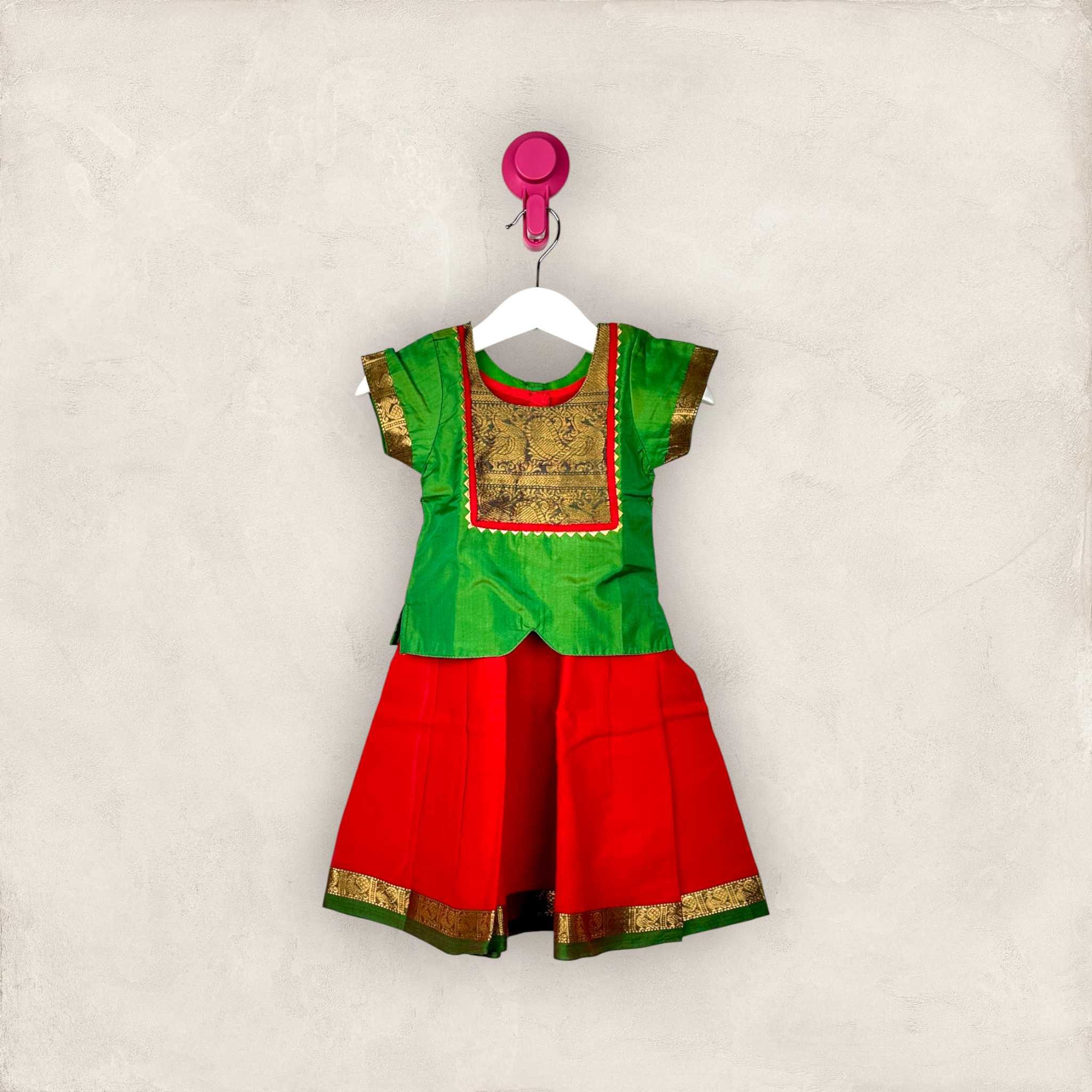 Red Handloom Cotton Pavadai With Green Chattai