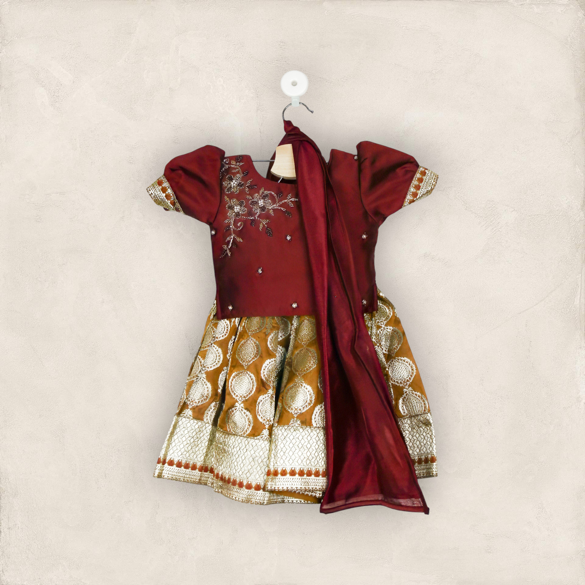 Wine And Mustard Tussar Lehenga And Choli Set With Dupatta